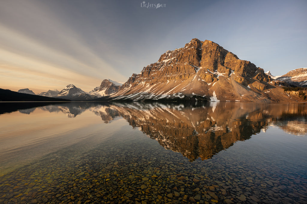 A spring sunrise over Bow Lake in the beautiful Canadian Rockies near Banff Alberta. Taken in July 2025.